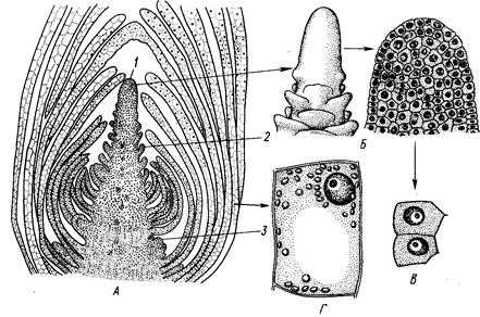 1 ~ конус нарастания, 2 — зачаток листа, 3 — бугорок пазушной почки