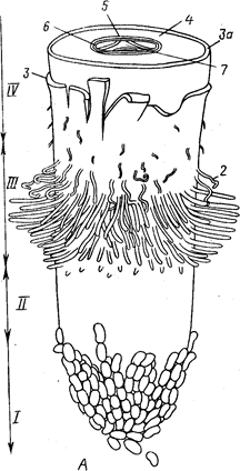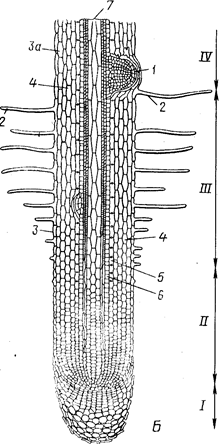 Различные части корня выполняют неодинаковые функции и характеризуются определенными морфологическими особенностями. Эти части получили название зон (рис. 2). Кончик корня снаружи всегда прикрыт корневым чехликом, защищающим апикальную меристему. Клетки корневого чехлика продуцируют слизь, покрывающую поверхность корня. Благодаря слизи снижается трение о почву, и ее частицы легко прилипают к корневым окончаниям и корневым волоскам.