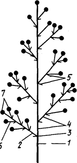 1 — главная ось, 2 — боковая ось (паракладии), 3 — узлы, 4 — междоузлия, 5 — прицветники, 6 — цветоножки, 7 — цветки