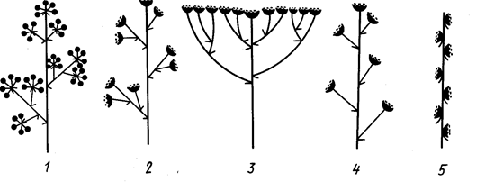 1 — метелка зонтиков, 2 — метелка корзинок, 3 — щиток корзинок, 4 — кисть корзинок, 5—колос корзинок