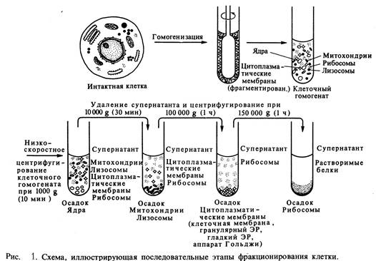 Сравнительно недавно был создан другой метод фракционирования клеток – центрифугирование в градиенте плотности; при этом центрифугирование производят в пробирке, в которой предварительно наслаивают друг на друга растворы сахарозы все возрастающей концентрации, а следовательно, и возрастающей плотности. При центрифугировании содержащиеся в гомогенате органеллы располагаются в центрифужной пробирке на тех уровнях, на которых находятся растворы сахарозы, соответствующие им по плотности. Этот метод дает биохимикам возможность разделять органеллы одинаковых размеров, но разной плотности (рис. 1.).