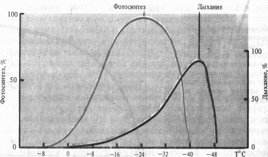 Для дыхания каждого вида растений и его органов существуют определенные минимальные (когда дыхание еще возможно), оптимальные и максимальные температуры. В отличие от фотосинтеза дыхание у зимующих растений наблюдается при очень низких температурах (у хвои ели и сосны при — 25 °С). Температурный оптимум его у большинства видов умеренных широт лежит в пределах 35 — 40 °С, т. е. на 5 — 10 °С выше, чем для фотосинтеза. Максимальные температуры (45 — 55 °С) определяются способностью белков к денатурации.