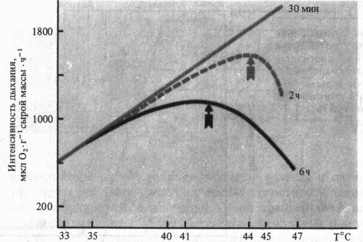 При рассмотрении влияния на дыхание крайних температур важно учитывать продолжительность действия этого неблагоприятного фактора. Так, при кратковременных экспозициях (30 мин) температурный оптимум дыхания листьев гречихи сахалинской может быть очень высок (> 47 °С), тогда как при двухчасовом действии оптимум смещается к 44 °С, а при шестичасовом—до 42 °С.