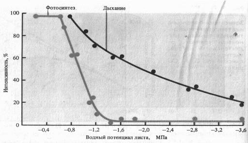 Водный режим. Изменение оводненности тканей растения отражается на интенсивности дыхания. В листьях проростков при быстрой потере воды вначале отмечается усиление дыхания — обычная кратковременная реакция на раздражение. При постепенном снижений оводненности этого не происходит. Продолжающийся водный дефицит вызывает постепенное снижение дыхания, причем более медленное, чем падение интенсивности фотосинтеза. Более раннее прекращение фотосинтетической активности при водном дефиците является следствием закрытия устьиц (уменьшение поступления С02 в лист) и потери тургорного давления в клетках.