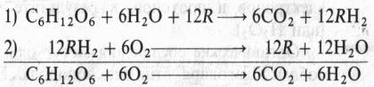 где R — это окрашенный дыхательный пигмент, способный отнимать водород от субстрата, a RH2 — бесцветный дыхательный хромоген. На первом, анаэробном, этапе дыхания глюкоза окисляется за счет отнятия водорода, который с помощью фермента (редуктазы) передается на дыхательный пигмент R (активация водорода!). По Палладину, дыхательный субстрат окисляется с участием воды, от которой тоже отнимается водород. Согласно первому уравнению весь С02 дыхания анаэробного происхождения. На втором, аэробном, этапе дыхательный хромоген (RН2) регенерирует в окисленную форму. Кислород, по Палладину, необходим не для включения в дыхательный субстрат, а для отнятия электронов и протонов от RН2, в результате чего образуется вода. В дальнейшем теория Палладина об анаэробной и аэробной фазах дыхания и о роли воды в дыхательном процессе полностью подтвердилась.