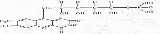 FMN (рибофлавин-5-фосфат) содержит гетероциклическое азотистое основание — диметилизоаллоксазин, спирт рибит (производное рибозы) и фосфат: