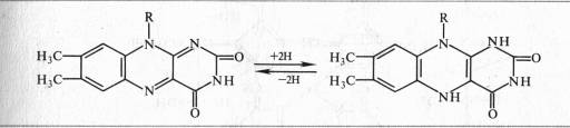 Активной группой в реакции присоединения и отдачи электронов и протонов в FMN и FAD служит изоаллоксазин. Взаимодействие с восстановленным переносчиком, например NADH, происходит следующим образом: