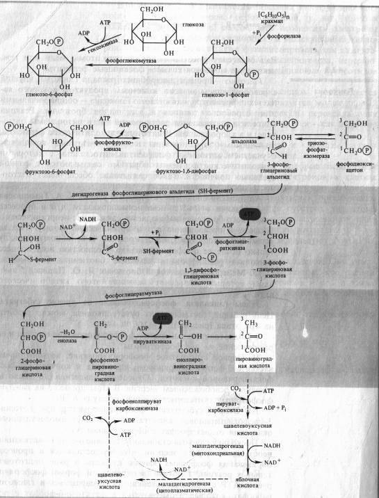 Обращение гликолиза. Возможность обращения гликолиза определяется обратимостью действия большинства ферментов, катализирующих его реакции. Однако реакции фосфорилирования глюкозы и фруктозы, а также реакция образования пировиноградной кислоты из фосфоенолпирувата, осуществляемые с помощью киназ, необратимы. На этих участках процесс обращения идет благодаря использованию обходных путей. |Там, где функционируют гексокиназа и фруктокиназа, происходит дефосфорилирование — отщепление фосфатных групп фосфатазами.