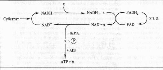 Химическая и механохимическая шпотезы сопряжения. Согласно химической гипотезе в митохондриях имеются интермёдиаторы белковой природы (X, Y, Z), образующие комплексы с соответствующими восстановленными переносчиками. В результате окисления переносчика в комплексе возникает высокоэнергетическая связь. При распаде комплекса к интермедиатору с высокоэнергетической связью присоединяется неорганический фосфат, который затем передается на ADP: