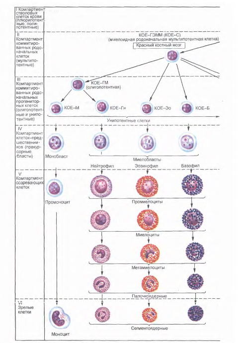Все приведенные выше стадии развития клеток составляют четыре основных компартмена: I - стволовые клетки крови (плюрипотентные, полипоте нтные); II - коммитированные родоначальные клетки (мультипотентные); III - коммитированные родоначальные (прогенторные) олигопотентные и унипотентные клетки; IV - клетки-предшественники (прекурсорные).