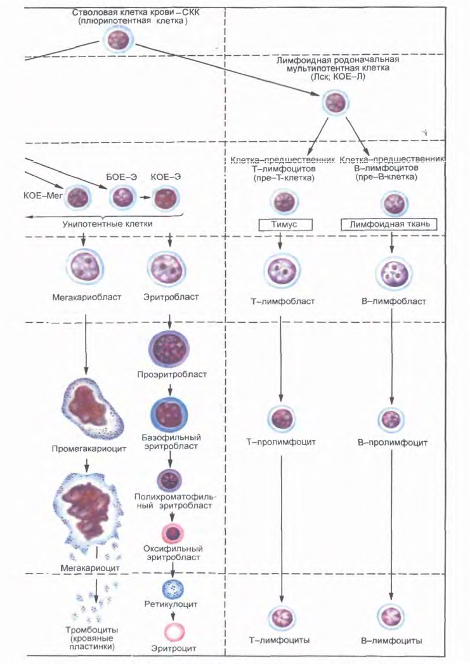 Исследование клеточного состава колоний позволило выявить две линии их дифференцировки. Одна линия дает начало мультипотентной клетке - родоначальнице гранулоцитарного, эритроцитарного, моноцитарного и мегакариоцитарного рядов гемопоэза (КОЕ-ГЭММ). Вторая линия дает начало мультипотентной клетке - родоначальнице лимфопоэза (КОЕ-Л). Из мультипотентных клеток дифференцируются олигопотентные (КОЕ-ГМ) и унипотентные родоначальные (прогениторные) клетки.