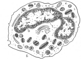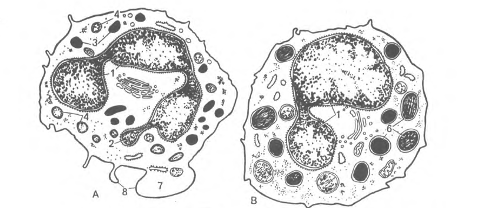 А - сегментоядерный нейтрофильный гранулоцит; Б – эозинофильный (ацидофильный) гранулоиит; В - базофильный фанулоцит: 1 - сегменты ядра; 2 - тельце полового хроматина; 3 – первичные (азурофильные) гранулоциты; 4 - вторичные (специфические) гранулы; 5 - зрелые специфические гранулы эозинофила, содержащие кристаллоиды; б - гранулы базофила различной величины и плотности; 7 - периферическая зона, не содержащая органелл; 8 – микроворсинки и псевдоподии.