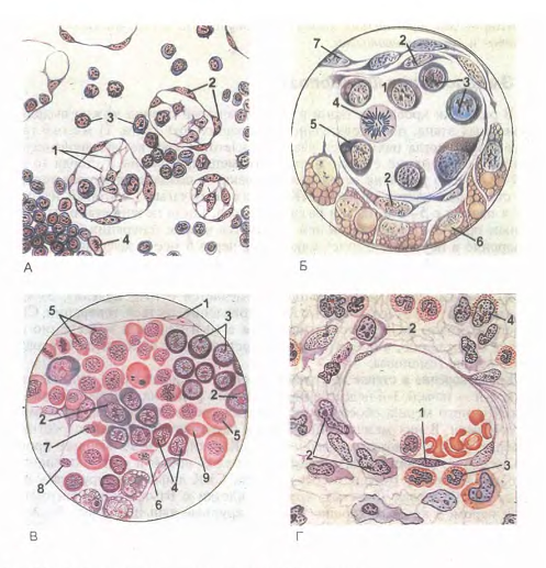 А - кроветворение в стенке желточного мешка зародыша морской свинки: 1 - меэенхималыгые клетки; 2 - эндотелий стенки сосудов; 3 - первичные кровяные клетки-бласты; 4 - митотическос деление бластов; Б - поперечный срез кровяного островка зародыша кролика S'/j сут: I - полость сосуда; 2 - эндотелий; 3 - интраваскулярные кровяные клетки; 4 - делящаяся кровяная клетка; 5 - формирование первичной кровяной клетки; 6 - энтодерма; 7 - висцеральный листок мезодермы. В - развитие вторичны); эритробластов в сосуде зародыша кролика 13'Д сут: 1 - эндотелий; 2 - проэритробласты; 3 - базофильные эритробласты; 4 - полихроматофильные эритробласты; 5 - оксифильные эритробласты (нормобласты); 6 - оксифильный эритробласт с пикнотическим ядром; 7 - обособление ядра от оксифильного эритробласта (нормобласта); 8 - вытолкнутое ядро нормобласта; 9 - вторичный эритроцит. Г - кроветворение в костном мозге зародыша человека с длиной тела 77 мм. Экстра во скул я рное развитие клеток крови: 1 - эндотелий сосуда; 2 - бласты; 3 - нейтрофильные гранулоциты; 4 - эоэинофильный миелоцит.