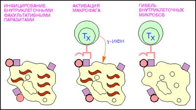 Рис.7: Активация макрофагов Т - хелпетами (кружки - поверхностный микробный антиген; красные квадраты - молекулы MHC класса II, волнистые линии - внутриклеточные паразиты.).