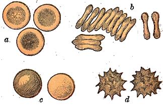 Форма и строение. Популяция эритроцитов неоднородна по форме и размерам (рис.9). В нормальной крови человека основную массу (80-90 %) составляют эритроциты двояковогнутой формы - дискоциты. Кроме того, имеются планоциты (с плоской поверхностью) и стареющие формы эритроцитов - шиловидные эритроциты, или эхиноциты (~ 6 %), куполообразные, или стоматоциты (~ 1-3 %), и шаровидные, или сфероциты (~ 1 %)