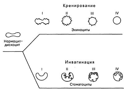 Рис.11. Изменение формы эритроцитов в процессе старения (схема). I, II, III, IV - стадии развития эхиноцитов и стоматоцитов (по Т. Фуджии).