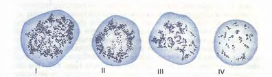 Рис.12. Ретикулоциты (по Г.А. Алексееву и И.А. Кассирскому). Зернисто-сетчатая субстанция имеет вид клубка (I), отдельных нитей, в виде розетки (II, III), зернышек (IV).