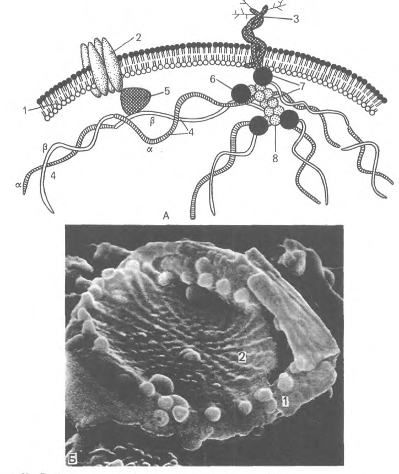 Рис.14. Строение плазмолеммы и цитоскелета эритроцита. А - схема: 1 - плазмолемма; 2 - белок полосы 3; 3 - гликофорин; 4 - сттектрин {а - и р - цепи); 5 - анкирин; 6 - белок полосы 4.1; 7 - узловой комплекс; 8 - актин; Б - плазмолемма и цитоскелет эритроцита в сканирующем электронном микроскопе. - плазмолемма: 2 - сеть спектрина.