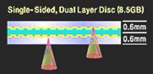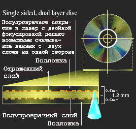 Нетрудно заметить, что простейшим способом удвоения емкости является использование двухсторонних дисков. Производители могут изготавливать диски DVD толщиной 0.6мм, что в половину меньше толщины стандартного диска CD. Это дает возможность соединить два диска обратными сторонами и получить емкость в 9.4Gb. По другой технологии, создается второй слой для размещения данных, это позволяет увеличить емкость одной стороны диска. Первый слой делается полупрозрачным, таким образом лазерный луч может проходить через него и отражаться уже от второго слоя. По этой схеме на каждой стороне дика можно разместить по 8.5GB данных.