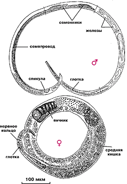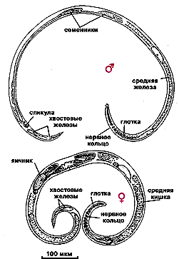 Семейная жизнь и резкий половой диморфизм свойствен паразитическим гельминтам, в том числе и нематодам. В ткани пищевода и желудка некоторых водных холоднокровных позвоночных паразитируют самки нематод Hedruris, самец же спирально обернут вокруг тела самки. Самец поражающего трахеи птиц паразита Syngamus trachea находится в постоянно спаренном состоянии с более крупной самкой, как бы прирастая к ней рядом с половым отверстием. Наконец, у Trichosomoides crassicauda, паразитов мочевого пузыря крыс, крошечные самцы живут непосредственно в половых путях самки.