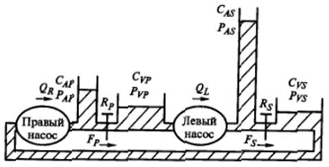 В упрощенной гидравлической модели системы кровообращения (рис.3) один механический насос (левый) перекачивает кровь из легочной вены в артерию большого круга со скоростью QL, а второй (правый) перекачивает кровь из вены большого круга в легочную артерию со скоростью QR. Индексы A и V относятся, соответственно, к артерии и вене, а P и S - к цепям малого и большого кругов. Система содержит фиксированный объем крови B, распределенный между четырьмя резервуарами, причем предполагается, что объем насосов и связывающих их трубок пренебрежительно мал.