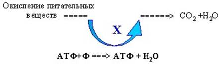 Как же синтезируется эта молекула, то есть, как образуется макроэргическая связь между фосфатами? Это было одно время загадкой. Существовало предположение о том, что есть какое-то вещество Х, химический посредник, осуществляет связь между процессами, дающими энергию, то есть окислением питательных веществ до СО2 и Н2О, и каким –то образом энергия окисления (в своем роде медленное "горение" внутри организма) переходит в энергию макроэргической связи в молекуле АТФ. Это предположение о наличии химического посредника, которого никто найти не мог, называлось гипотезой химического сопряжения (рис. 6).