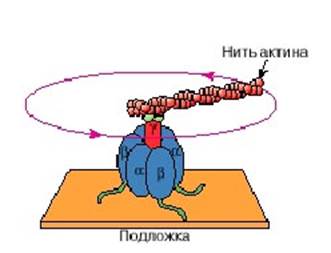 Для того, чтобы доказать, что в АТФ синтазе вращается часть машины, F1 фрагмент перевернули, «пришили» к неподвижной подложке, а к гамма-субъединице навесили искусственным образом нить актина (длинный белок, который можно было увидеть в микроскоп, так как он был мечен флуоресцентной меткой). Затем подали к этой системе энергию в виде АТФ, и оказалось, что при наличии АТФ гамма субъединица начала крутиться. Все это сняли на пленку. Было видно, как крутится флуоресцентная метка на актиновом хвостике, и было показано, что действительно происходит вращение во время работы этой молекулярной машины (рис. 10).