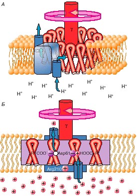 Структура этой машины такова, что протон проваливается через полуканал с наружной стороны митохондриальной мембраны, но попасть внутрь митохондрии он не может. Сваливается протон на подставленную ему аминокислоту ротора и эту аминокислоту протонирует, то есть на аминокислоте появляется дополнительный положительный заряд. Затем, когда протонированная аминокислота на вращающемся роторе доедет до следующей половинки канала, ведущей уже внутрь митохондрии (а внутри протонов мало и, кроме того, там протон поджидают отрицательно заряженные ионы), то протон наконец "падает" внутрь и аминокислота освобождается от положительного заряда. Заряды в роторе и статоре расположены таким образом, что протонирование – депротонирование приводит к повороту машины. Таким образом, протон в два приема проваливается внутрь митохондрии, и за счет этого мотор проворачивается.