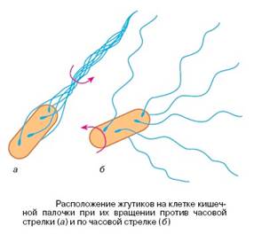 Известно, что не все, но некоторые бактерии могут двигаться. Для того, чтобы двигаться, они вертят хвостом, т.е. жгутиком. Если жгутиков несколько, то во время вращения они сплетаются в единый жгут, и вращаются, двигая бактерию, примерно как лопасти у катера (рис. 13).