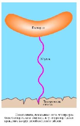 Жгутик очень маленький, в световой микроскоп его трудно увидеть. Для того, чтобы проверить, действительно ли жгутик вращается при движении бактерии, бактериальную клетку за жгутик прикрепили к стеклу (рис. 14). В раствор добавили вещество, которое она любит, например, сахар, и она начала вертеться, потому что она явно хотела добраться до сахара, если не добавляли, то она вела себя более спокойно.