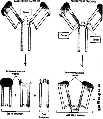 Рисунок 5. Различные фрагменты, образующиеся при расщеплении молекул антител двумя различными протеолитическими ферментами (папаином и пепсином), помогли исследователям в выяснении четырехцепочечной структуры антител.