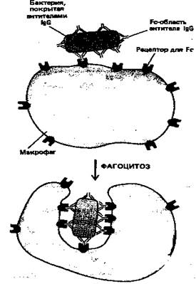 Рисунок 6. Эта схема показывает, как бактерия, покрытая антителами IgG, эффективно фагоцитируется макрофагами, имеющими на своей поверхности рецепторы, способные связывать Fc-область молекулы IgG. Связывание бактерии с этими рецепторами активирует процесс фагоцитоза.