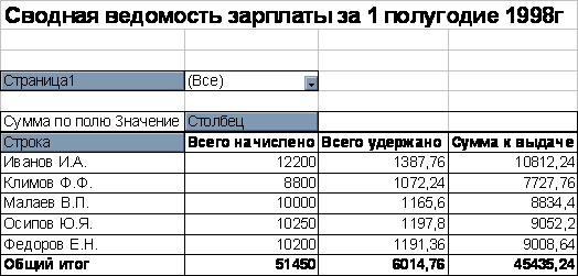 Для построения сводной ведомости за весь 1998 год не обязательно переносить их на один рабочий лист EXCEL , а можно воспользоваться средством консолидации мастера сводных таблиц.