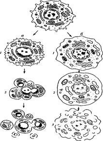 а – апоптоз (профаммированная клеточная смерть): / – специфическое сжатие клетки и конденсация хроматина, 2 – фрагментация ядра, 3 – фрагментация тела клетки на ряд апоптических телец; б – некроз: / – набухание клетки, вакуолярных компонентов, конденсация хроматина (кариорексис), 2 – дальнейшее набухание мембранных органоидов, лизис хроматина ядра (кариолизис), 3 – разрыв мембранных компонентов клетки – лизис клетки