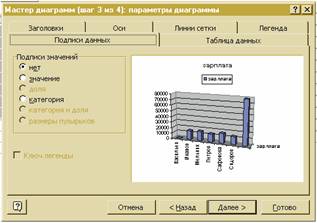 Если Вы не сделали заголовка диаграммы и надписей на осях на пятом шаге работы с Конструктором, то сделайте это сейчас. Для этого вызовите директиву Titles из меню Insert. В открывшемся диалоговом окне нужно указать место для надписей, которые Вы хотите ввести. Чтобы ввести надпись, нужно включить опциональные кнопки Chart Title, Value (Y) Axis и Category (X) Axis. Для трехмерных диаграмм появляется еще одна кнопка для надписей на третьей оси.