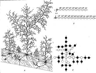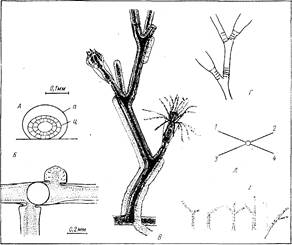 Боковые ветви 1-го порядка отходят от каждого междоузлия стебля. Верхушка роста ветви закладывается на основании ножки гидранта с прилежащей стороны, несколько сбоку от плоскости, проходящей через ножку и междоузлие ствола. Существует довольно строгая последовательность отклонения ветвей 1-го порядка от этой плоскости: поочередно по две то влево, то вправо (рис, 2,Д). Это обеспечивает приблизительно крестообразное расположение их относительно оси стебля. Ветви 1-го порядка перпендикулярны стволу и параллельны субстрату. Эти правила ветвления полностью распространяются и на ветви 2-го и 3-го порядков.