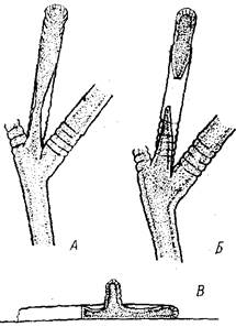 Рис. 3. Образование фрустул: Л — фруетулообразующая ветвь, Б — отделение фрустулы от ценосарка колонии, В — прорастание фрустулы на субстрате, вид сбоку