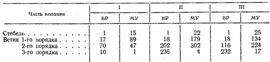 Это приводит к большей концентрации гидрантов на единице занимаемой колонией площади. У трех обследованных нами “гигантских” побегов 90% междоузлий, а соответственно гидрантов, и верхушек роста приходилось на боковые ветви побегов (табл. 3). Такая ситуация вообще характерна для видов с разветвленными побегами.