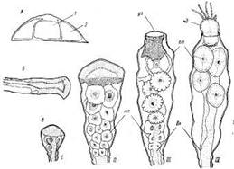 Рис. 2. Obelia geniculata. A—поперечный срез гидроризы; Б—верхушка гидроризы сверху; В — последовательные стадии развития гонангия; /—10 августа 1981 г.;//—через 50 ч после /; III—через 47 ч после //; IV—через 47 ч после ///: / — ценосаркальная полость, 2 — утолщение перисарка; бл — бластостиль, гт — гонотека, уг — устье гонотекн, мп — медузоидная почка, мд — медуза