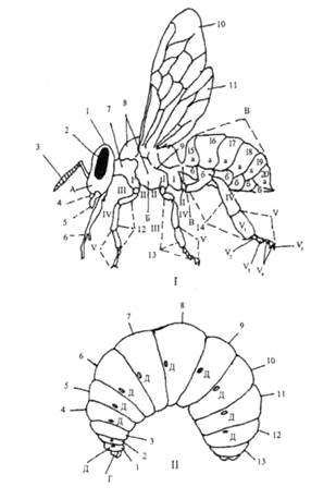 Рис. 2. Тело пчелы и личинки: / — пчела: А — голова: / — простые глаза; 2 — сложный глаз; 3 — усики; 4 — верхняя губа; 5 — верхняя челюсть; б — хоботок. Б — грудь: 7 —переднегрудь; 8 —среднегрудь; 9 — заднегрудь; 10 — переднее крыло; 11 — заднее крыло; 12 —передняя ножка; 13 — средняя ножка; 14 — задняя ножка; 15 — ляжка; 16 — вертлуг; 17 — бедро; 18 — голень; 19 — лапка; 20 — членики лапки; в — промежуточный сегмент (стебелёк). В — брюшко: 15-20 — членики брюшка; а — спинные полукольца (тергиты), 6 — брюшные полукольца (стерниты). П — личинка: Г — голова; 1-3 — грудные членики; 4-13 — брюшные членики; Д — дыхальца