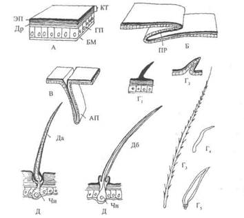 Рис. 3. Строение стенки тела пчелы и ее видоизменения: А — строение стенки тела пчелы: КТ — кутикула; ГП — гиподерма; БМ — базальная мембрана; ЭП — эпидермис; Д — дерма (кожа). Б — межсегментальная стенка тела пчелы: ПР — перепонка. В — внутренний вырост стенки тела (аподема) — АП. Г — волоски пчелы и их видоизменения: rt — сплошной волосок, Гг — полый волосок, Г3 — перистый волосок, Г4_5 — волоски, покрывающие некоторые места ножек пчел. Д — чувствующие волоски: Да — основание волоска помещено внутри стенки тела; Дб — основание волоска помещено в бугорке стенки тела; Чн — чувствующий нерв