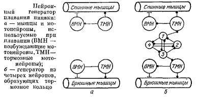 Схема на рис. 53, б совершенно симметрична, но реально при подготовке к плаванию какие-то нейроны начинают возбуждаться чуть раньше других. Пусть, например, первым возбудился нейрон 1, он сейчас же затормозит нейроны 3 и 4, и они будут «молчать». Нейрон 2 никем не тормозится и возбудится под действием общего сигнала вслед за нейроном 1. Когда это произойдет, затормозятся нейроны 1 и 4. Теперь нейрон 3 никем не тормозится и через некоторое время он заработает, затормозив нейроны 1 и 2. Таким образом, нейроны 1—4 будут поочередно возбуждаться. Когда будет возбуждаться нейрон 71, он будет тормозить тормозные МН спинных мышц, тогда возбуждающий МН заставит эти мышцы сократиться, и данный сегмент изогнется выпуклостью вниз. Когда будет возбуждаться нейрон 3, сегмент будет изгибаться в противоположную сторону.