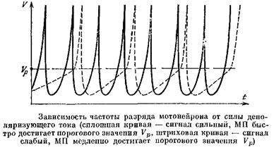 Легко понять, что как только МП первого нейрона достигнет порога возбуждения, второй нейрон выдаст импульс, обычный ПД, стандартной амплитуды и длительности. Но период работы клетки-генератора гораздо больше, чем длительность ПД. Кончится и рефрактерный период, а генератор будет продолжать передавать на второй нейрон потенциал, достаточный для его возбуждения,— возникнет новый импульс и т.д. Получается, что во время деполяризации клетки-генератора на мембране второй клетки успевает возникнуть целая серия ПД, а во время гиперполяризации получается пауза между сериями.