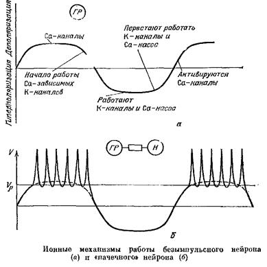 Такой нейрон будет работать следующим образом. При МП в —60 мВ кальциевые каналы откроются и ионы кальция начнут поступать в клетку? которая деполяризуется, и это состояние будет некоторое время сохраняться. Когда внутри клетки накопится достаточное количество Са, кальций-чувствительные К-каналы откроются, и возникнет идущий наружу калиевый ток. Этот ток гиперполяризует нейрон и Са-каналы закрываются.