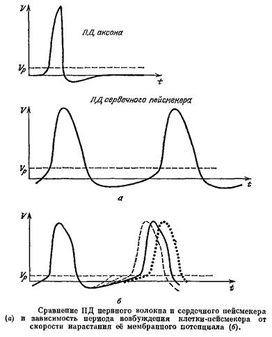В отличие от потенциала гигантского аксона потенциал клетки синусного узла после возникновения ПД не удерживается на каком-либо равновесном уровне; он начинает опять сдвигаться в сторону деполяризации, пока не достигнет порогового уровня, после чего возникает новый ПД.