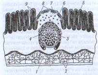 Рис. 2. Строение перовой бляшки: 1-мышечный слой слизистой оболочки; 2-лимфатические сосуды; 3-центр размножения; 4-фолликул; 5-кишечная ворсинка; 6-эпителий, ассоциированный с фолликулом; 7-купол; 8-М-клетка; 9-крипты Либеркюна.