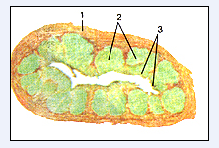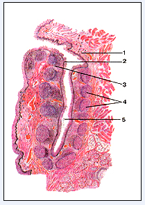 Поперечный срез. 1-стенка аппендикса; 2-лимфоидные узелки; 3-эпителиальный покров.