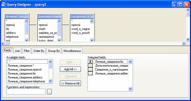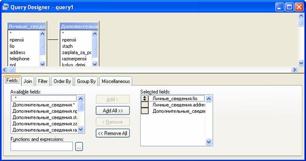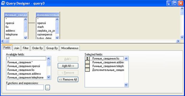 Необходимо добавить две таблицы «Личные сведения» и «Дополнительные сведения». Связь таблиц установится автоматически через поле npensii. Во вкладке fields (Поля) выберем нам нужные первой и второй таблицы поля, после чего добавим их в поле Selection fields (выбранные поля) через кнопку add> (добавить вправо), что и изображено на рисунке 2.6.1.1.