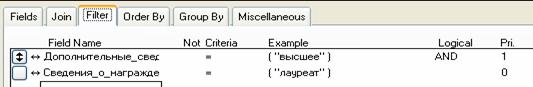 Затем перемещаемся во вкладку Filter (фильтр) и там уже непосредственно и произведем отбор из пенсионеров тех, которые нам нужны. Для этого выберем в после Fields (Поля) дополнительные сведения.education (поле образование во второй таблице). Затем в поле Criteria (Критерий) укажем знак равенства (=). В поле Example (пример) введем слово «высшее» в кавычках. Полная строчка будет означать: «Если в поле Образование есть слово высшее то отфильтровать». Нажать на кнопку insert, для вставки еще одного фильтра (условия). В поле Fields (поля) ввести сведения о награждениях.sved_o_nagrazh. В поле Example слово лауреат в кавычках. В Criteria выбрать знак равенства (=) На рисунке 2.6.1.2 изображена вкладка Filter (фильтр).