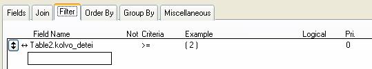 Устанавливаем фильтр для данного запроса, который заключается в выборе поля table2.kolvo_detei, установления критерия больше или равно (>=), а затем ставим минимальное число два (2). Фильтр отображен на рисунке 2.6.2.2.